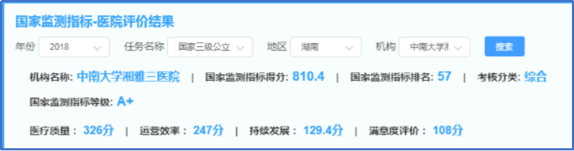 近日,国家卫健委公布了2018年度三级公立医院绩效考核国家监测指标考核结果,全国三级公立医院首张“国考”成绩单出炉,中南大学湘雅三医院总分810.4分,在全国2398所三级公立医院中排名57,评价等级A+,湖南排名第2。