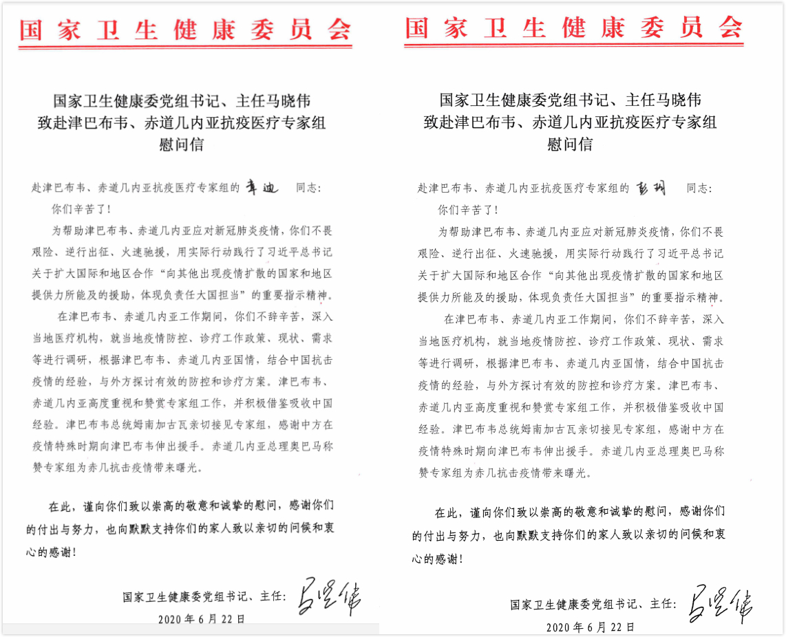 近日,赴津巴布韦、赤道几内亚抗疫医疗专家组成员湘雅三医院重症医学科副主任彭玥、检验科副主任章迪收到国家卫生健康委党组书记、主任马晓伟发来的慰问信。信中,马晓伟感谢他们用实际行动践行了习近平总书记关于扩大国际和地区合作“向其他出现疫情扩散的国家和地区提供力所能及的援助,体现负责任大国担当”的重要指示精神,并向他们的家人致以亲切问候。