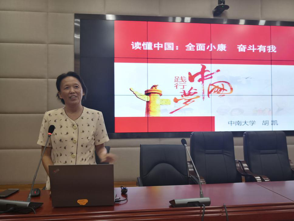 胡凯指出,中南大学的学子是非常优秀的高素质人才,是受到中央和全国人民关注的一个群体,更加应该在中国特色社会主义建设中干出成绩。最后,她提出青年人一定要树立“团结奋斗,振兴中华”,“ 向‘建设现代化强国’迈进!”的伟大目标,为祖国社会主义现代化建设贡献力量。