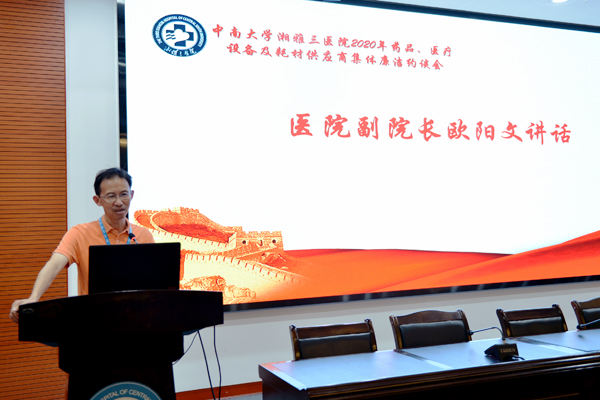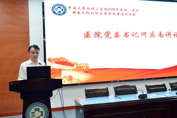 何庆南首先代表医院对众多合作企业长期以来对新湘雅建设发展,尤其是这场惊心动魄的抗疫大战和历史大考中的无私帮助表示感谢。他解读了国家卫健委、湖南省卫健委《2020年医疗行业作风建设工作专项行动方案》,分析了医药购销领域反腐的严峻形势,对院商正常关系、医药代表行为规范、拒绝红包回扣等问题进行了强调。“合作关系要亲密,更要有底线。”他对药品、医用设备和耗材供应商廉洁从业提出了要求:一要认清形势,提高认识,认真学习国家有关文件精神,牢牢把握政策底线和法律红线,自觉遵守相关要求,不要有任何侥幸心理;二要行业自律,规范行为,坚决杜绝违规进行各类促销活动,严禁向医院工作人员进行商业贿赂;三要诚信经营、廉洁经商,努力为医院提供优质、价格合理的产品,从源头上纠正并遏制药品器械、医用耗材购销领域的不正之风。他还分享了抓细节、重实效,高压态、强监督,精执纪、严问责,综合施治、惩防并进“新湘雅”医疗行风建设工作思路。