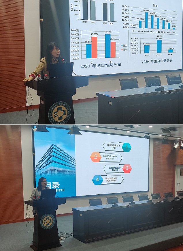 接下来的专题讲座中,杨霖以“国家自然科学基金申请”为题为大家进行了申请流程、申请学科等方面的解读,并介绍了科学网等一列实用网站。她还从肿瘤、神经系统疾病、中医药等方向详细地为大家进行了案例分析、设计思路、发散思维等方面的讲解,并通过分析历年来的立项标书为大家介绍了中标热点大方向。黄瑞雪做了题为“2020国自申报回顾和2021年申请展望”的讲座,她以2020年国自申报性别、年龄分布、立项医院排行榜等为切入点为大家进行了政策解读,并着重分析了国家自然科学基金深化改革要点,希望大家掌握好政策走向,读好指南,积极撰写标书。最后,黄瑞雪从基金项目评审和管理的机制出发分析了国家科技创新发展新时期的国自资助导向,强调大家一定要学会提前布局,注重标书细节,完成高质量标书。