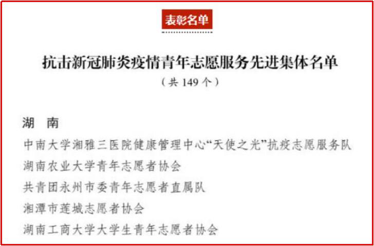 为褒扬广大青年志愿者和志愿者组织在抗击新冠肺炎疫情这场严峻斗争中的突出表现,大力弘扬生命至上、举国同心、舍生忘死、尊重科学、命运与共的伟大抗疫精神,凝聚和激发广大团员、青年投身全面建设社会主义现代化国家新征程的青春奋斗,经党中央批准,共青团中央、中国青年志愿者协会于10月23日表彰了一批抗击新冠肺炎疫情青年志愿服务先进集体和个人。经院党委同意,院团委精心组织推报,在各级领导关心指导下,通过逐级评选,中南大学湘雅三医院健康管理中心抗疫志愿服务队荣获“全国抗击新冠肺炎疫情青年志愿服务先进集体”荣誉称号。本次全国共表彰先进集体149个,其中湖南省5个,湘雅三医院健康管理中心团队代表医院并作为湖南省卫生健康系统唯一团队入选。