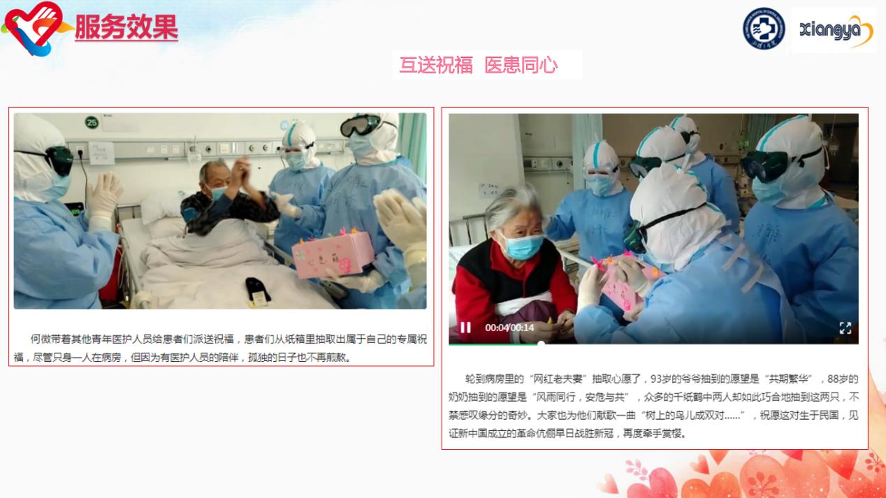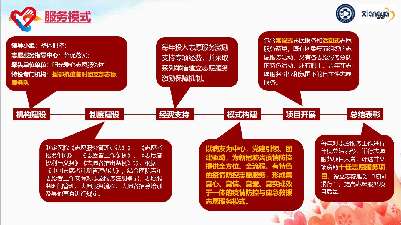 新冠疫情防控过程中,面对危急而惨烈的疫情形势,中南大学湘雅三医院阳光爱心志愿服务团在充分调研分析基础上,发挥专业优势,立足行业攻坚,组建湖南省首个湖北抗疫前线“临时团支部”战疫志愿服务队(青年突击队),组织发起抗击疫情爱心“1+1”病房里的“临时家属”等系列志愿服务活动,取得丰硕战果,涌现出一批青年优秀典型与先进事迹。在抗疫一线,湘雅三医院抗疫志愿者们不仅创新方式方法,发挥专业所长,科学防控疫情,突出医疗国家队精湛医术与顶尖水平;更贴心呵护病友,加强人文关怀,主动与新冠病人“1+1”结对,成为危重患者“临时家属”,照顾其生活起居;同时面向公众与社会,积极宣传推广健康防疫知识,加强科普宣教,推出“关爱套餐”。在湖北,面对收治的86例武汉新冠肺炎重症患者,志愿者们帮助解决病人生活需求、心理需求,充当医患之间的传话筒给予医疗康复指导,并组织了“雷锋日”“女神节”专题活动。此外,还向武汉群众捐赠了一批爱心物资,分发给28家当地养老机构,帮助到2000多位受困老人。在湖南,200余名医护技人员主动报名支援发热门诊、门诊预检分诊处及呼吸与危重症学科等防疫抗疫重点科室,92名行政后勤青年踊跃报名支援门诊分诊关爱病友。仅1-4月,医护志愿者共接待服务发热患者2667名,累计为数以万计的患者送去关爱,提供安全、有序、放心、高效的医疗服务。志愿者们还不间断为500余名抗疫一线医护人员及病友们送上爱心盒饭、爱心饮品、爱心零食包等8000余份,协调防护物资、生活物资等1000余份。
