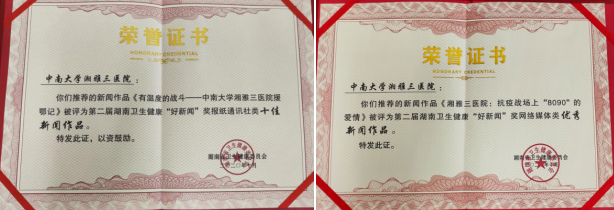 在第二届湖南卫生健康“好新闻”奖评选中,经医院推选、专家评审,光明日报记者龙军撰写的《有温度的战斗——中南大学湘雅三医院援鄂记》荣获报纸通讯社类十佳新闻作品,党委宣传部李姗撰写的新闻《湘雅三医院:抗疫战场上“8090”的爱情》被评为网络媒体类优秀新闻作品。