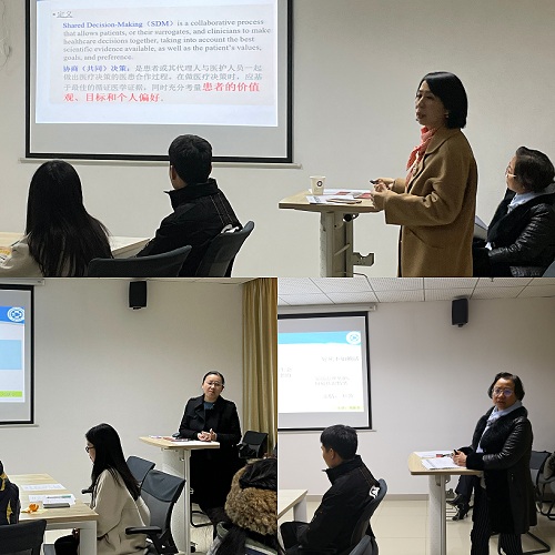 杨明施老师以生动的临床案例切入,从ICU经常面临的“生死抉择”两难境地入手,将学员们的注意力和兴趣充分调动起来。刘新春老师将人文关怀和医学伦理概念导入互动讨论,详细阐述了“家属——医护人员协商决策(FCSDM)模式”及“FCSDM五习惯沟通法”。彭玥老师则在理论讲述过程中穿插案例分析,启发学员们踊跃提问。互动环节,20多名学员分为三组,按照事前准备的案例,对医患共同决策过程进行情景再现。学员们分别扮演医生、护士、家属,观察员则使用量表和沟通清单对全过程进行记录。最后,每组派代表上台做总结发言。整个过程气氛活跃,学员们纷纷表示,不仅从理论上提高了对医患共同决策重要性和必要性的认识,更是从分组演练上切实学习到了有效沟通的步骤和技巧。