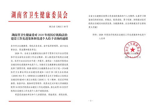1月12日,湖南省卫生健康委对2020年度医疗机构法治建设工作先进集体和先进个人给予表扬的通报,中南大学湘雅三医院荣获湖南省“2020年度医疗机构法制建设工作先进集体”,同时,医院院长张国刚荣获湖南省“2020年度医疗机构法治建设工作先进个人”,这是医院首次同时获得省级法治建设先进集体和先进个人殊荣。