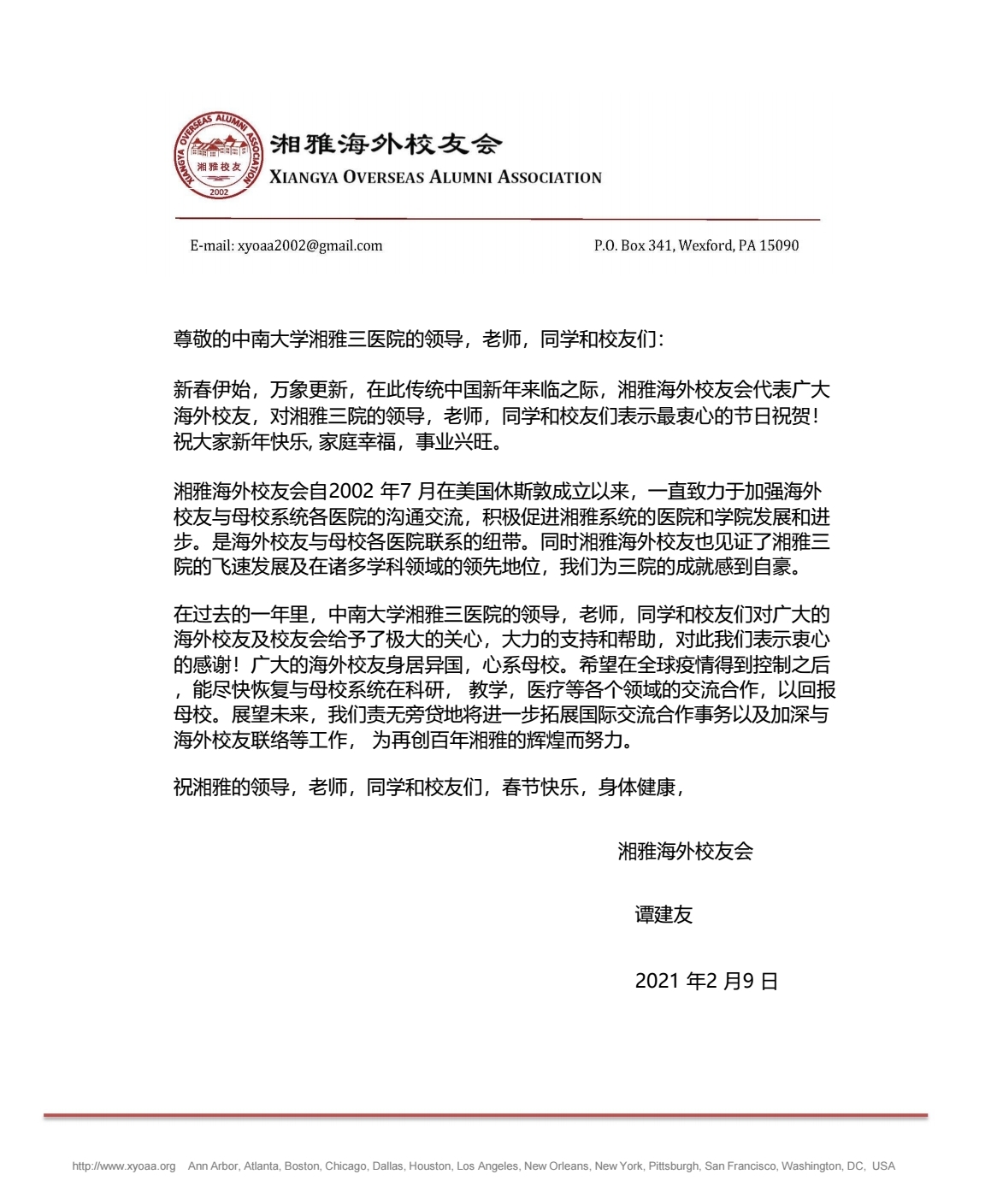 2021年2月10日,湘雅海外校友会新任会长谭建友博士代表全体海外校友向医院发来贺信,送上新春祝福。