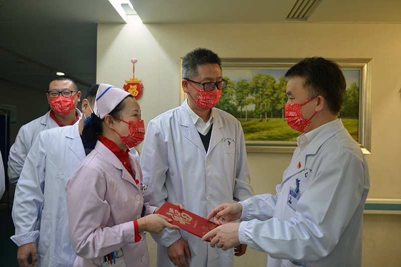 为了降低疫情传播风险,减少人员聚集流动,全院干部职工积极响应国家“就地过年”的号召,更多的医生、护士选择在除夕、春节坚守在工作岗位,把更多的关爱与时间留给患者。值班人员们表示,虽然没能回家过年,但有了院领导的慰问和红包,也感觉很温暖、很欣慰。