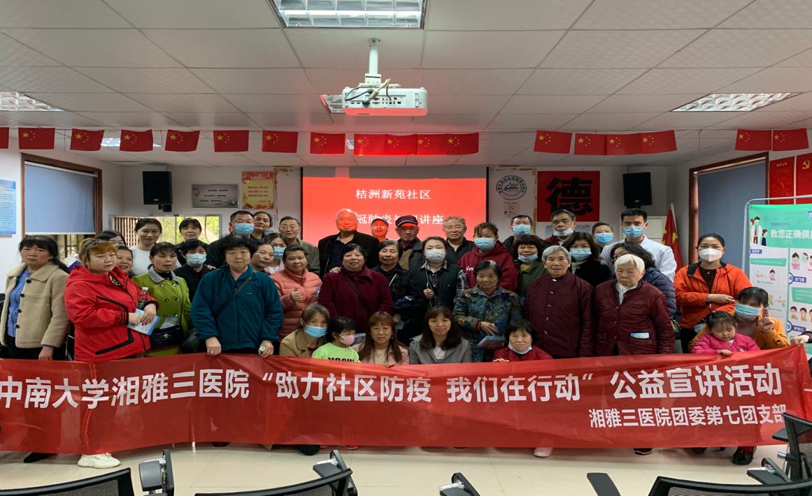 3月26日上午,中南大学湘雅三医院团委第七团支部、青年志愿服务分队联合岳麓区桔洲新苑社区开展了疫情防控健康科普知识专题宣讲活动。活动旨在进一步做好社区新冠疫情常态化防控工作,使广大社区居民更加了解新冠肺炎科普知识,倡导健康文明的生活方式。
