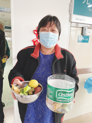 一位陪护人员一手端着自备的饭盒,一手捧着自制的饭盒,开心地说:“原来素食也这么美味”。