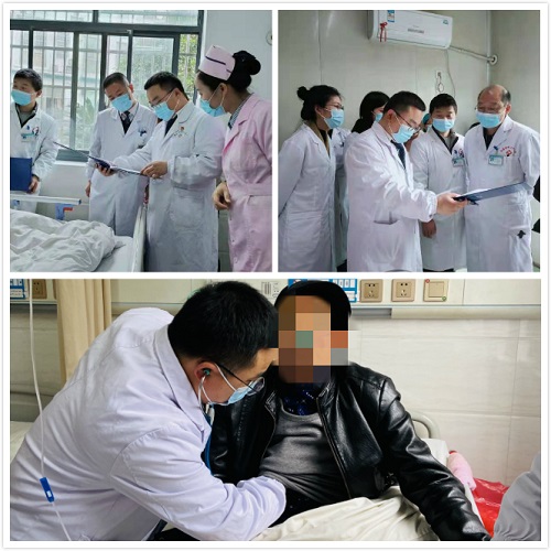 肿瘤科代理主任曹科教授带领义诊团队对白箬铺镇卫生服务中心的肿瘤及内科患者进行床旁查房。78岁的李大爷因患右肺鳞癌行放化疗后出现呼吸困难,伴恶心、呕吐,食欲不振。他的儿子专门将父亲的既往病历资料全部带到病房,请曹科教授、黄程辉教授以及张震主治医师等共同商讨,给予制定后续治疗方案。