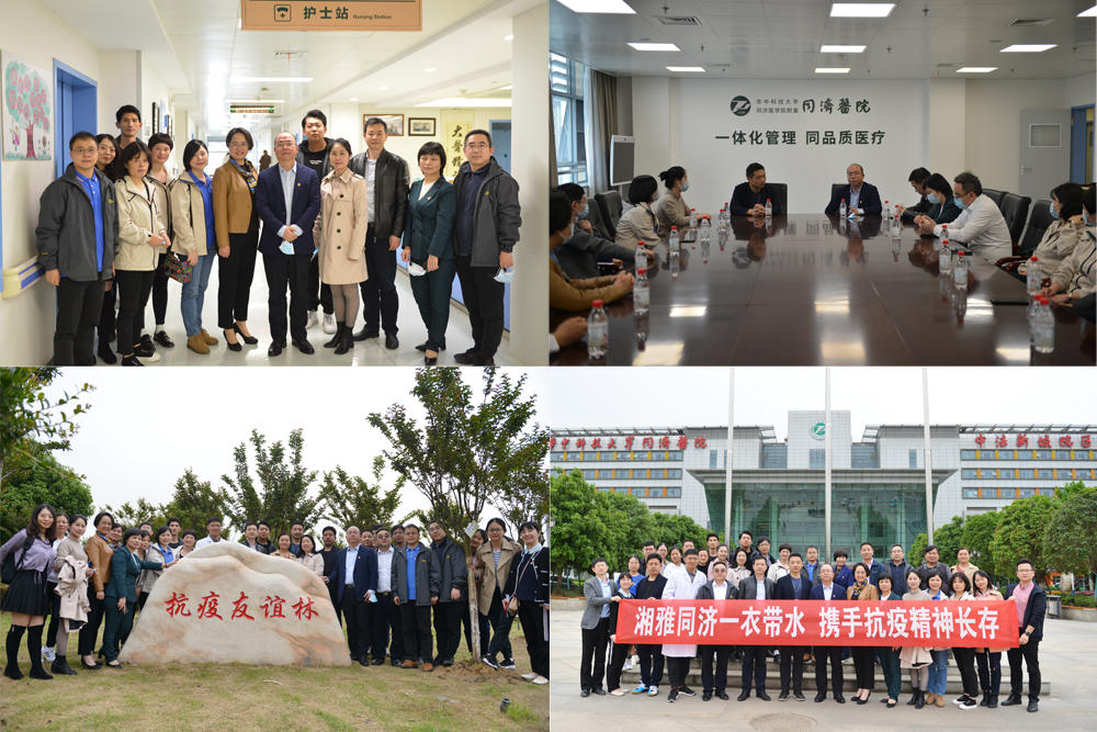 在华中科技大学同济医学院附属同济医院中法新城院区副院长祝文涛的陪同下,张劲强和援鄂国家医疗队临时党总支书记、队长王知非一行重回医疗队曾经奋战过的B7西区住院病房,重游抗疫友谊林,大家百感交集,感慨万千。2020年2月8日,医疗队紧急驰援武汉,130余名队员整建制接管一个重症病房,累计收治危重症患者86例,医护人员零感染。3月30日,医疗队圆满完成任务,平安返回。