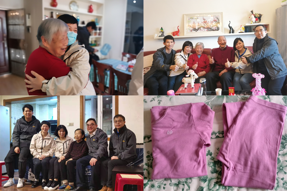 医疗队刘纯、钟竹青、刘作良、卜平元、张晓伟、韩睿、苏红辉、韩赛、赵晓勇等人“探亲”看望了当时医疗队收治年龄最大“8090”李奶奶孙爷爷夫妻以及80岁独居老人张奶奶。“8090”老夫妻拿出了当时医疗队赠送的一件内衣,分外感动。由于疫情缘故,大雪过后的武汉显得格外寒冷,重症病房的病人都来不及整顿行李,匆匆入院。“岂曰无衣,与子同袍。”在医疗队物资相对缺乏的情况下,所有队员心里想着病人,将随行的保暖内衣、奶粉等保暖物资、营养物资、生活物资捐赠给病人,和病人相互依靠,并肩作战。