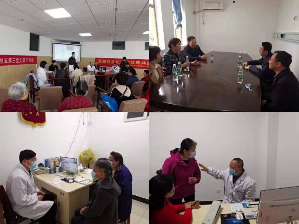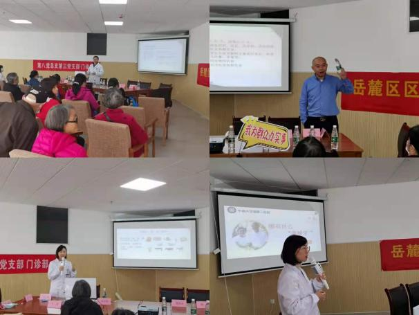 4月16日,第十二党总支杨华书记、第八党总支第三党支部阎雪彬书记、社会服务中心刘伶主任、门诊部彭兰副主任、门诊治疗室隆益香护士长以及临床科室范自力教授、王炼副教授、易波副教授、万波主治、王萌营养师、丁丹主管护师等老师前往岳麓区观沙岭社区普惠医院开展“学党史,干实事,健康服务到基层——区域党建交流暨健康教育活动”,100余位群众参与健康讲座和义诊。