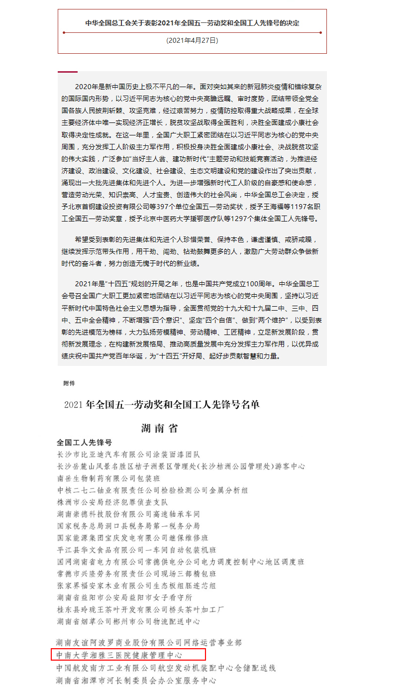 4月27日,2021年庆祝“五一”国际劳动节暨“建功‘十四五’、奋进新征程”主题劳动和技能竞赛动员大会在北京人民大会堂举行,会上表彰了2021年全国五一劳动奖和全国工人先锋号获得者。中南大学湘雅三医院健康管理中心荣膺“全国工人先锋号”称号,成为医院建院以来首个获此殊荣的基层班组,实现了历史突破。