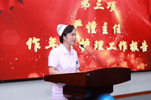 护理部主任严谨以“传承红色基因 续写百年芳华”为主题,进行年度护理工作报告。严谨指出,经过全体新湘雅护理人的勠力同心、拼搏奋斗,医院在疫情防控、护理质量、专科护理品牌、学科建设和护理管理等方面均取得优异的成绩;她指出下一阶段,医院护理将在做实临床护理质量和安全、提升专科护理实力、完善科学的管理体系、加强人才队伍和学科建设等方面做出更多努力。