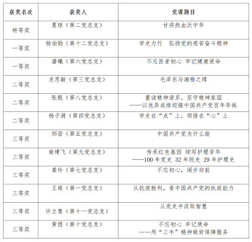本次微党课竞赛将党史学习及湘雅精神紧密结合,既是一次深刻的党史学习教育,也是一场生动的爱国主义教育。根据党课主题、内容、结构、参赛人语言仪态、技能及现场效果等进行综合评分,评选出特等奖一名,一等奖两名,二等奖三名和三等奖六名,由党委副书记杨飞龙宣布获奖名单。党委书记何庆南、党委副书记杨飞龙和党委副书记、纪委书记张劲强为获奖选手颁奖。