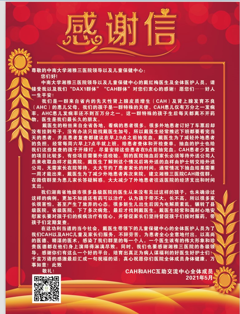 5月20日,在这个充满爱的日子里,湘雅三医院儿童保健中心喜获来自于“DAX1群体”和"CAH群体”的一份沉甸甸的感谢信。