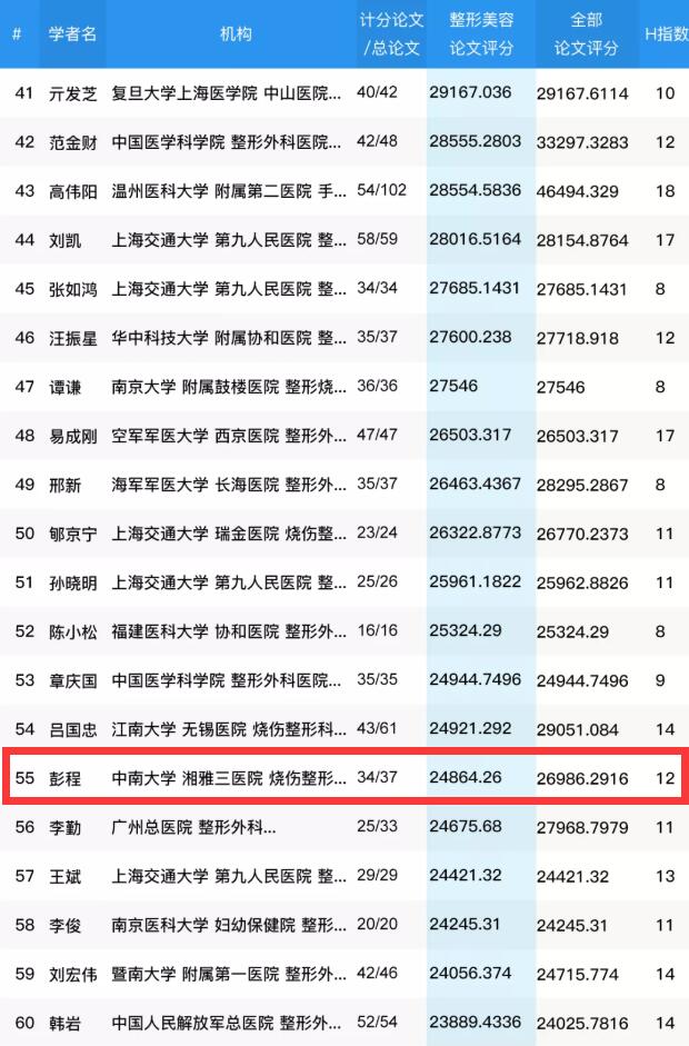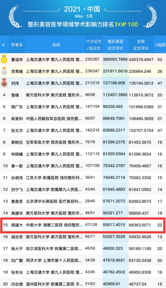 5月24日,全国整形美容医学专家学术影响力百强排名(2021年05月)公布,湖南省四名专家上榜,其中中南大学湘雅三医院整形美容科周建大教授排名15,彭程副教授排名55。