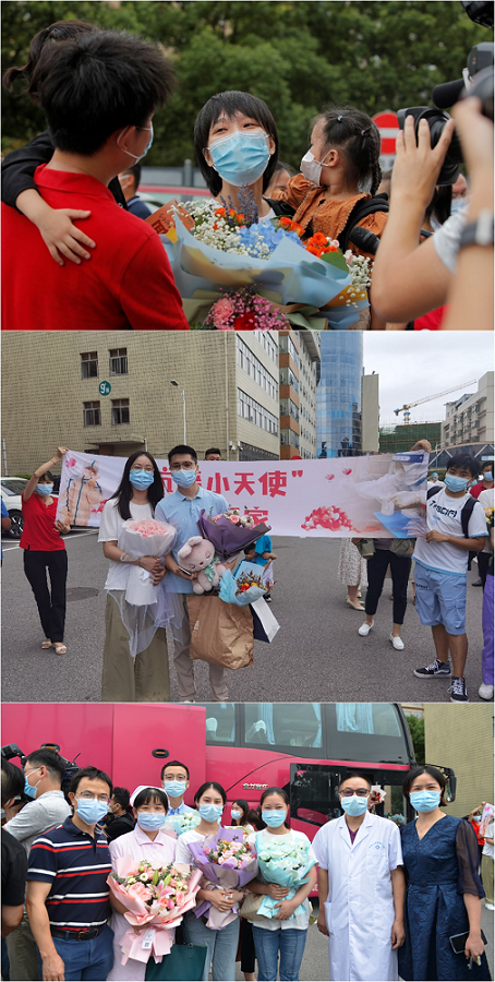 当大巴车缓缓停靠,英雄们迎着热切期盼的眼神,在热烈的掌声中下车,孩子们纷纷冲上前给妈妈送花,大人们准备了温馨的横幅和礼物迎接爱人和朋友,多日来的思念化成此刻重逢的喜悦。