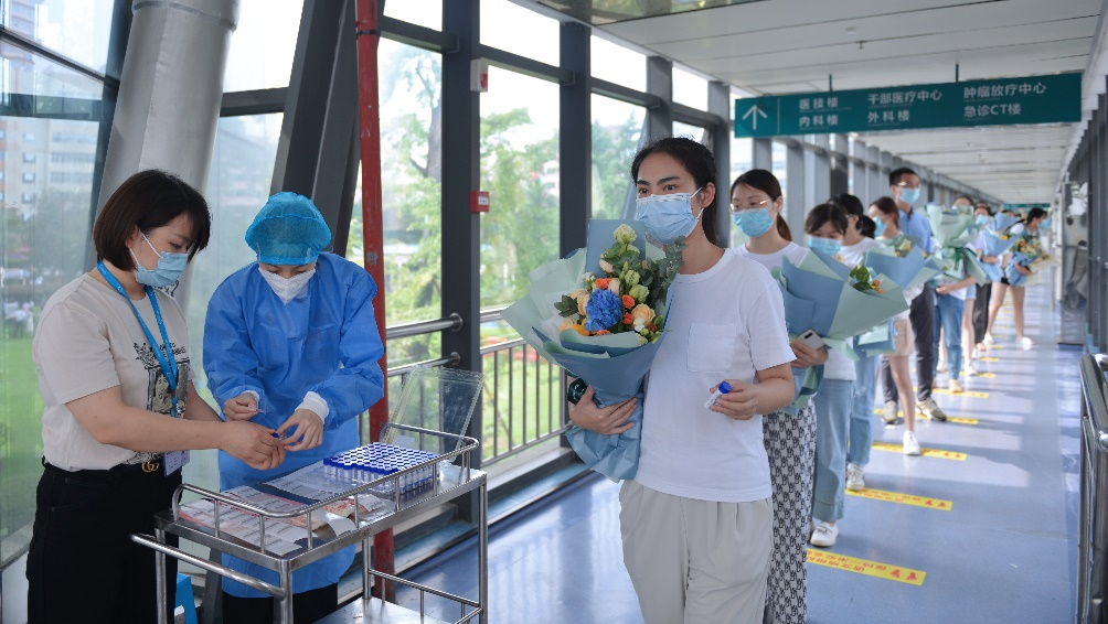 8月24日,中南大学湘雅三医院支援张家界核酸采样队50名队员圆满完成任务,胜利归来。医院全体在家院领导以及相关科室主任、职工代表、家属代表在医院迎接战疫英雄回家。