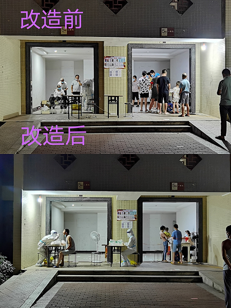 彭家巷居民点为民建房,环境相对差,人员管理难度较大,考虑到任务艰巨,社区工作人员特地准备了空调房作为采样区。采样队员到达现场后,发现环境不符合采样要求,果断放弃了“清凉的空调房”,立马将采样点调整至符合条件的通风处。