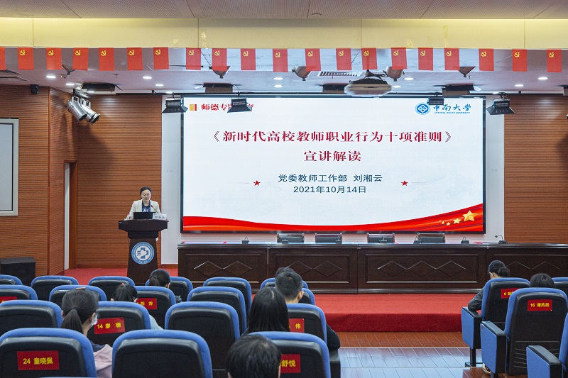 开班仪式结束后,中南大学党委教师工作部副部长刘湘云还进行了师德师风专题授课,对《新时代高校教师职业行为十项准则》进行宣讲解读。