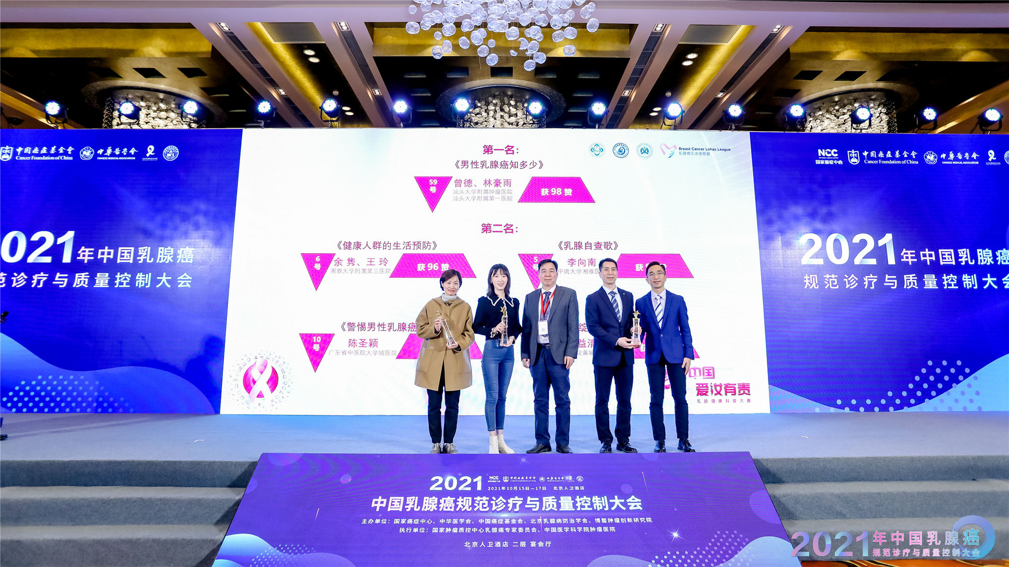 10月15日-17日,由国家癌症中心、中国癌症基金会、中华医学会、北京乳腺病防治学会、博鳌肿瘤创新研究院联合主办的“2021中国乳腺癌规范诊疗与质量控制大会”在北京召开。中南大学湘雅三医院乳甲外科主管护师余隽、护士长王玲制作的预防筛查类视频《健康生活方式,让乳癌君滚蛋吧!》在“健康中国,爱汝有责”第一届乳腺健康科普大赛中荣获第二名,并在大会上作为优秀作品展播。