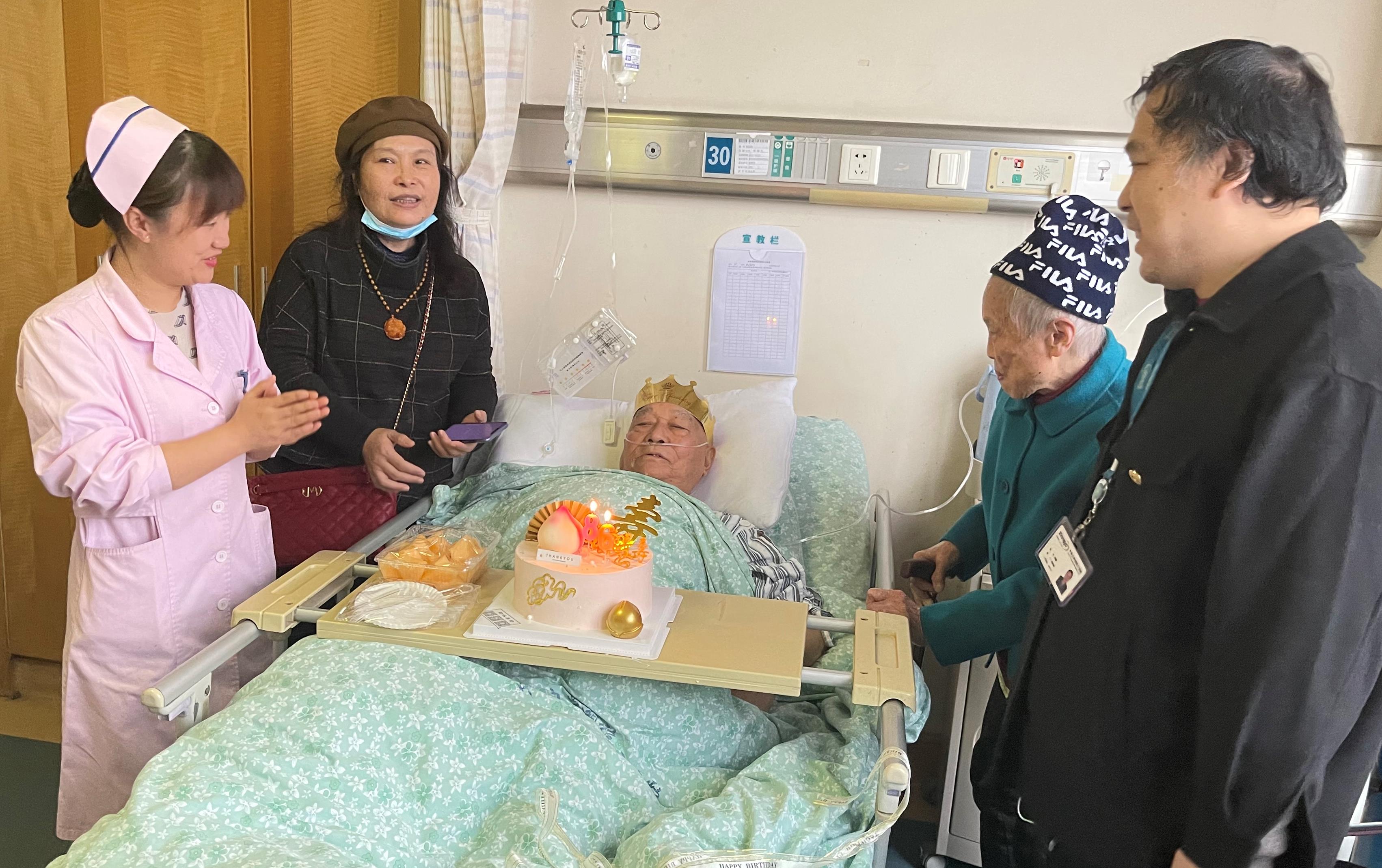 “祝您生日快乐!”2021年10月26日下午,骨科二十七病区的护士长和离退休部门负责人、第十二党总支书记围在杨伯勋老书记病床旁,唱着生日祝福歌,送上生日蛋糕,为杨老过生日。在得知杨伯勋老书记刚做完人工髋关节置换手术后,离退休部门受医院党委行政委托第一时间前往探望慰问,恰逢杨老86岁寿辰,共同见证了这温暖的一幕。