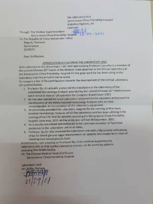 在西非这片贫瘠的土地上,现代检验技术对于疾病的诊断和指导治疗至关重要,而新湘雅检验人屈琳的坚持和坚守也成为中塞友好医院良好运行不可或缺的元素。有感于这位中国专家为塞国人民所付出的艰辛和努力,中塞友好医院院长及检验科塞方负责人专门向中国驻塞大使馆致信以表达他们对屈琳诚挚的谢意。