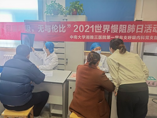 2021年11月17日是第20个“世界慢阻肺日”,今年的主题是“健康呼吸 无与伦比”, 为提高公众对于慢阻肺的疾病认知,加强对慢阻肺的长期管理,改善患者生活质量,在“世界慢阻肺日”到来前夕,中南大学湘雅三医院呼吸与危重症医学科开展义诊、宣教活动服务患者。