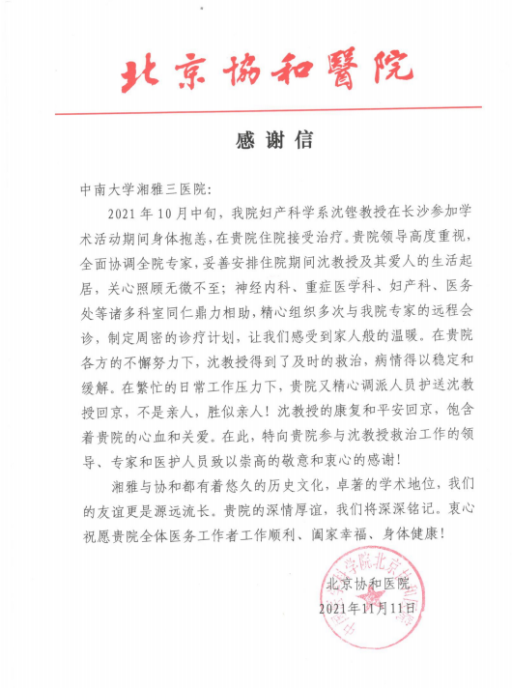 近日,中南大学湘雅三医院收到一封来自北京协和医院的感谢信。信里表达了北京协和医院对湘雅三医院医疗技术的肯定和医护人员的感谢,同时也传递了湘雅与协和的深厚情谊。