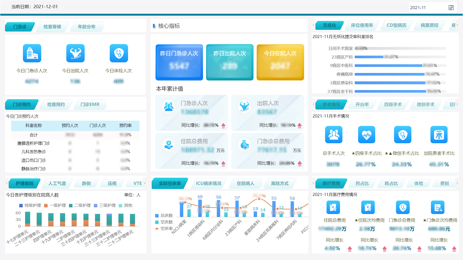 哪里是门诊患者的堵点?门诊患者走势和区域分布如何?哪些病种是区域主体病种?哪种诊疗方式更适合患者?科室绩效考核指标如何?空床率和空床分析怎样?…….这些都是现在医院管理层和临床科室最关心的指标,也是落实“为民办实事”,利用大数据分析精准便捷就医、消除堵点、进一步促进患者服务行动计划的核心宗旨。新推出的医疗数据智能监管平台,9大类,43小类,200余项指标全面掌控,院—科—组三级,更为科学、合理的划分管理内容和模式,直管到底,横向到边。此平台开拓新指标、合并老报表,统一全视图的可视化展示界面以及内容、指标、数据的可扩展性为医院各个层面提供医疗大数据服务实现协同。随着医疗数据监管平台的移动端的上线,手机可实时查看,医院和科室管理层能够随时随地掌握实时数据,跨时空、跨地域引导科学管理。