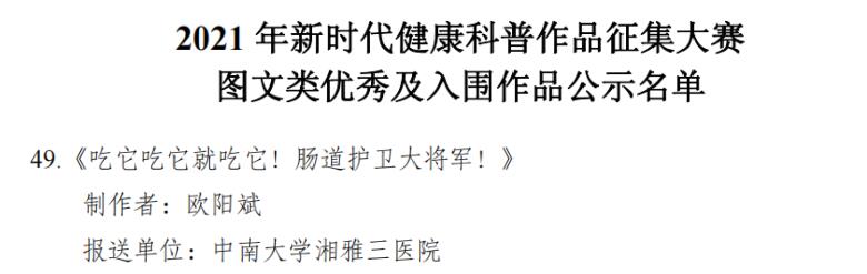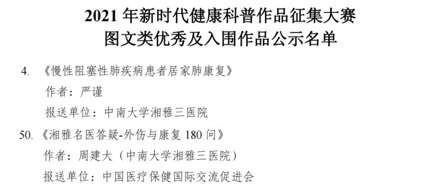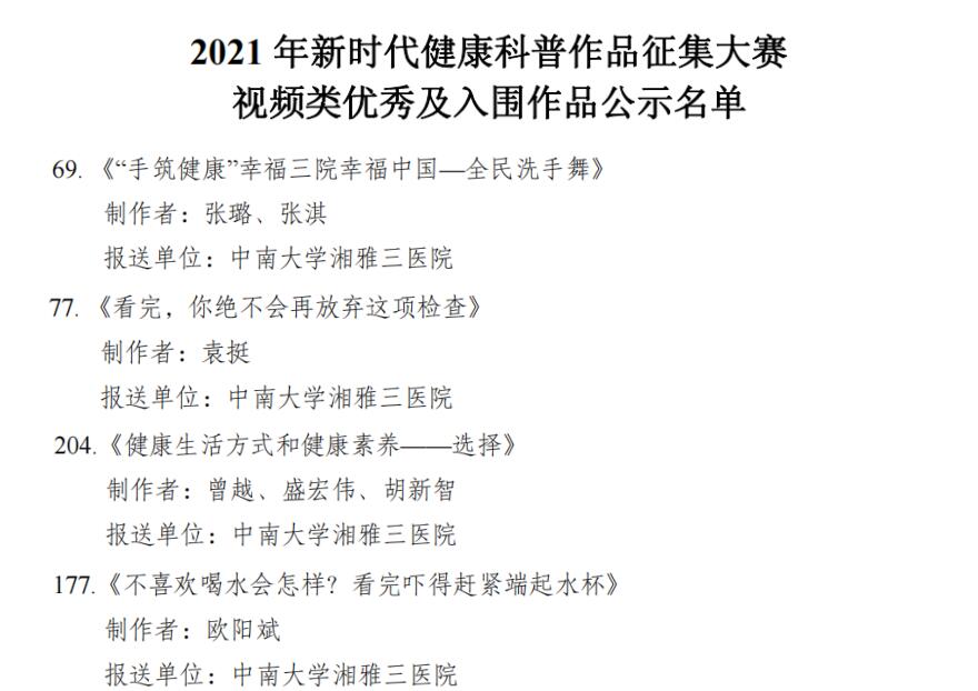 由国家卫生健康委、中央宣传部、科技部、中国科协共同组织开展的“健康知识普及行动—2021年新时代健康科普作品征集大赛”中,中南大学湘雅三医院《“手筑健康”幸福三院幸福中国—全民洗手舞》、《看完,你绝不会再放弃这项检查》获得微视频类优秀作品奖;《不喜欢喝水会怎样?看完吓得赶紧端起水杯》、《健康生活方式和健康素养—选择》获微视频类入围;《慢性阻塞性肺疾病患者居家肺康复》获图书类优秀作品奖;《湘雅名医答疑-外伤与康复 180问》获图书类入围;《吃它吃它就吃它!肠道护卫大将军!》获海报类入围。