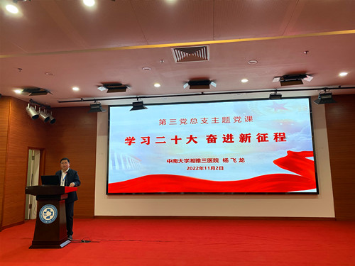 11月2日下午,中南大学湘雅三医院第三党总支组织全体党员、入党积极分子、科室(含教研室)正副主任、护士长在外科楼二楼学术报告厅开展专题党课,认真聆听了医院党委副书记杨飞龙以《学习二十大、奋进新征程》为主题的党课,深入学习贯彻党的二十大精神。会议由第三党总支书记朱锐主持。