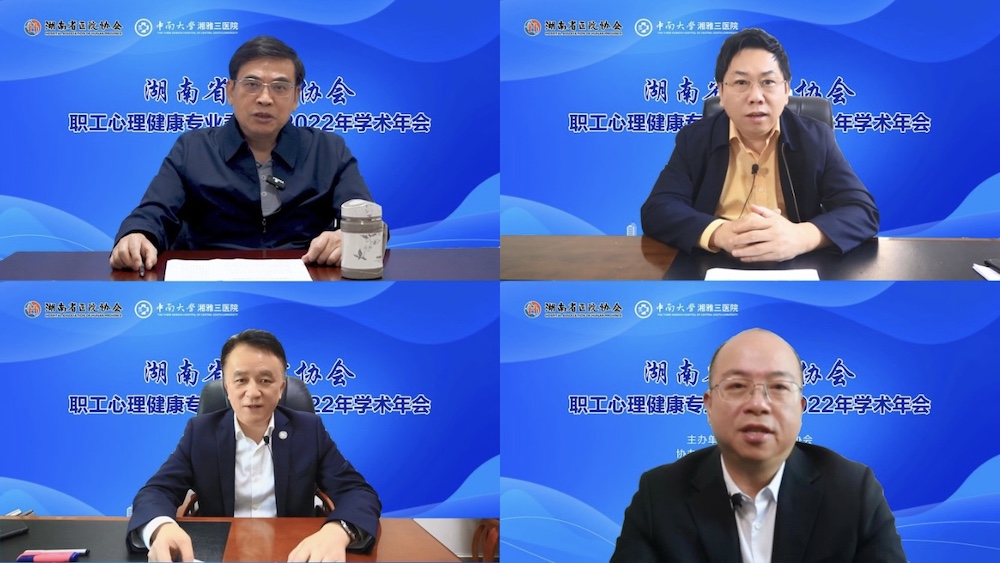 11月5日,由湖南省医院协会职工心理健康专业委员会主办、中南大学湘雅三医院承办的湖南省医院协会职工心理健康专业委员会2022年学术年会在线上顺利召开。湖南省医院协会会长陈卫红,中南大学党委常委、副校长陈立章,中南大学湘雅三医院党委书记何庆南,湖南省医院协会职工心理健康专业委员会主任委员、中南大学湘雅三医院党委副书记、纪委书记张劲强等出席云端会议并致辞,湖南省长沙市中心医院党委委员、副院长邓平主持开幕式,近1.14万人通过网络收看现场直播。