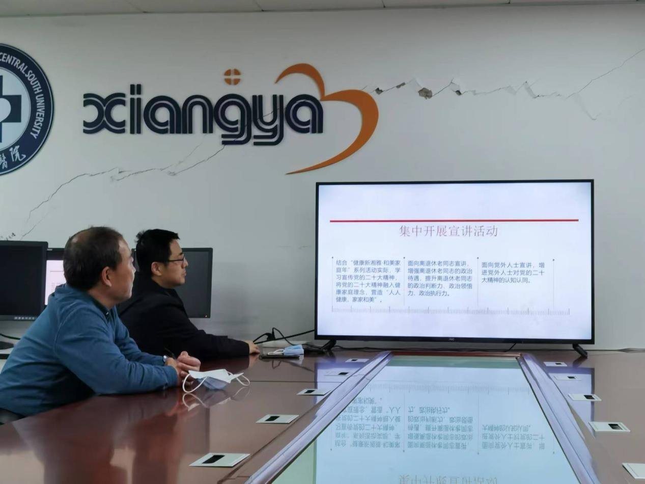 11月23日中午,中南大学湘雅三医院第八党总支第三党支部在健康管理中心五楼开展主题党日学习会。医院党委委员、副院长朱晒红出席并发言,第八党总支书记钟华和第八党总支第三党支部书记阎雪彬分别以《学习贯彻党的二十大精神》和《哪些新内容写入了党章》为题授课,第八党总支第三党支部三十余名党员参加学习。