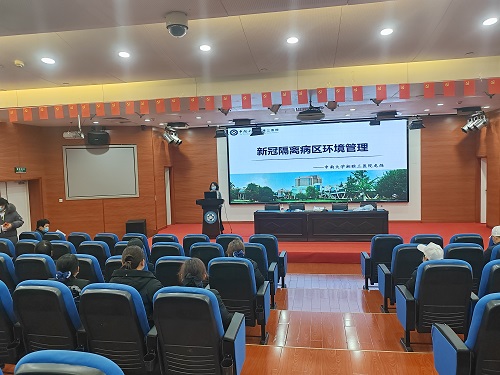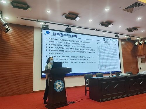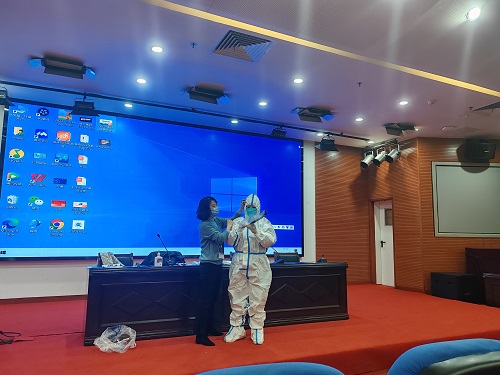 后勤保障部副主任龙烁从环境消杀原则、各类区域消杀要求、各区域清洁处理要求、医疗废物处理、个人防护要求等不同侧重点进行讲授。同时,在防控知识培训后,组织现场所有人员进行了防护服及防护用品穿脱培训。