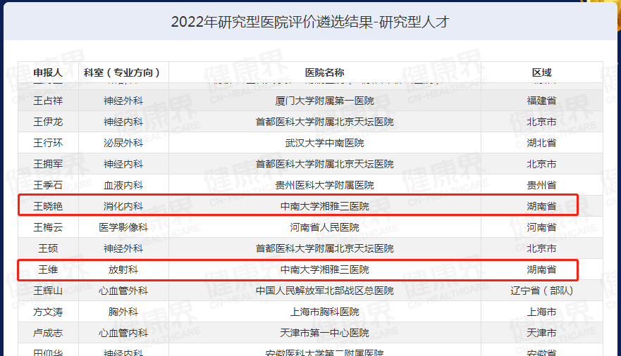 2022年12月30日于北京召开的中国研究型医院高峰论坛上传来喜讯,中南大学湘雅三医院消化内科、健康管理学科成功入选中国研究型学科,消化内科主任王晓艳教授、医学影像科学科带头人王维教授成功入选中国研究型人才。会议举行了首届中国研究型医院评价遴选结果发布仪式,对入选医院、学科及人才进行了颁牌。