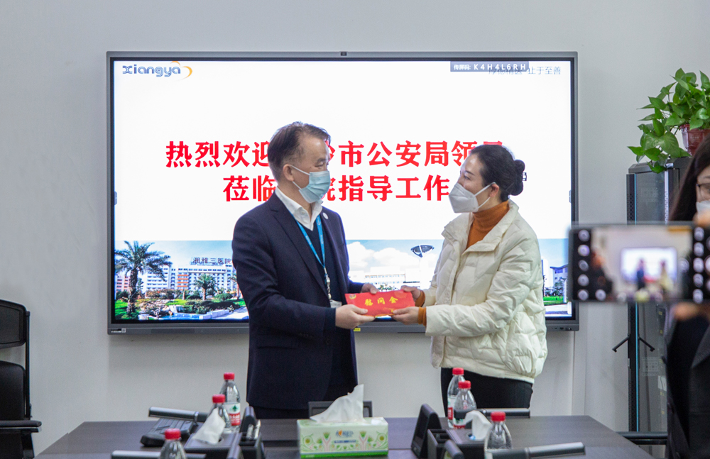 2023年1月12日下午,长沙市公安局党委委员、政治部主任唐明一行到中南大学湘雅三医院看望慰问一线医护人员,为医护人员送上慰问金,向奋斗在一线的医护人员送上新春的祝福和问候。医院党委书记何庆南,党委委员、副院长欧阳文和邓云龙及相关职能部门负责人共同参加。