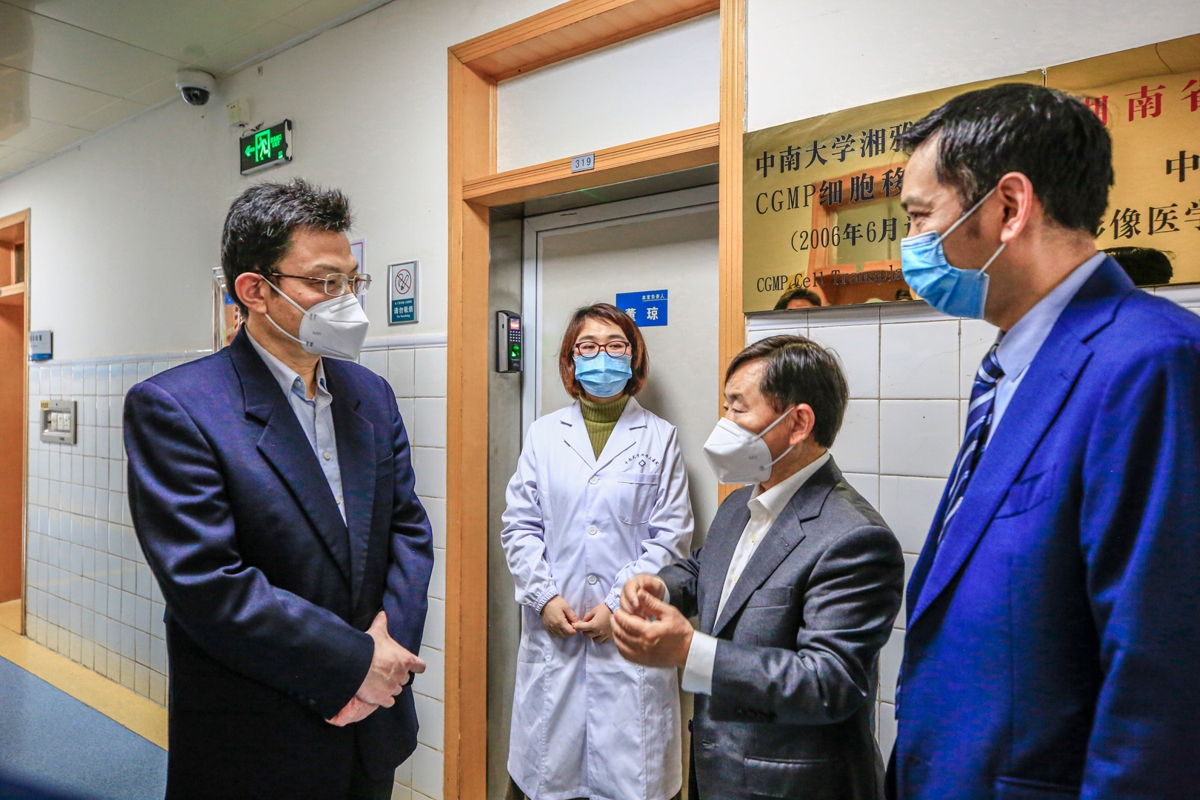 1月13日上午,中南大学校长李建成,党委副书记李景升、付刚华一行专程来到湘雅三医院,视察湖南省异种移植工程技术研究中心,听取了相关工作汇报。湘雅三医院党委书记何庆南,党委副书记杨飞龙,党委委员、副院长朱晒红、欧阳文陪同走访。