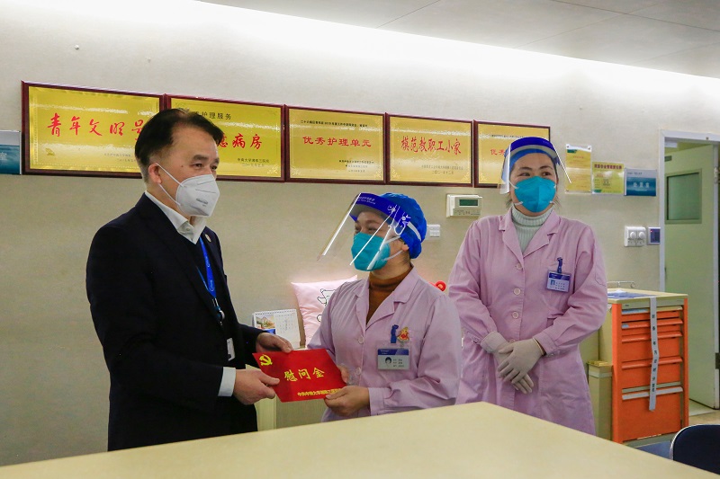 2023年1月13日上午,中南大学湘雅三医院党委书记何庆南,党委副书记杨飞龙,党委副书记、纪委书记张劲强一行走访慰问医务人员、生活困难党员、职工。党办、党委宣传部、工会负责人陪同,相关党总支书记参加。