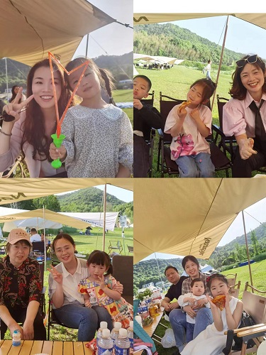 下午两点,大家陆续达到活动现场。蓝天白云映衬下的一片英式庄园大草地,白色的天幕帐篷和碧绿的池塘点缀其中。平时,分散在不同病区和实验室的同事们都在各自的岗位忙碌。现在,天幕之下,不常见面的大家都围坐在一起谈论着工作和生活中的趣事,分享美食。阳光里,闲不住的孩子们在草地上嬉戏,一串一串七彩的泡泡从他们手中飞向远处。各色的小飞盘从草地上腾空而起,追逐它们的是孩子们快乐的脚步和一张张上扬的稚嫩笑脸。为了促进同事们相互熟悉和了解,孩子们进行“我和我的爸爸妈妈”小演讲,大胆地向大家介绍自己的爸爸妈妈。血液内科大家庭在草地上合影,大人和孩子们都胸贴血液内科科标,喊出了“血液内科,越来越好”的响亮口号。夕阳西下,草地上架设起的烧烤炉上,诱人的肉香扑鼻而来。营地的灯火陆续点亮,血液内科的“美食家”们把热气腾腾的烤串端上了餐桌,水果、饮料、卤味和炒饭再次把氛围拉满。