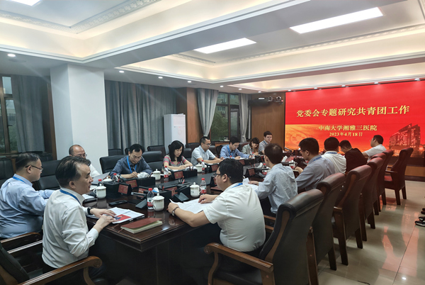 4月18日上午,中南大学湘雅三医院党委专题研究共青团工作会议在综合楼一会议室召开,会上进一步传达学习了习近平总书记在庆祝中国共青团成立100周年大会上的重要讲话精神和习近平总书记《论党的青年工作》的有关重要论述,医院党委听取了团委、医务社工与志愿服务指导中心工作汇报并对团委工作作出重要指示。院党委书记何庆南主持会议,全体院领导、院团委主要负责人参加会议。
