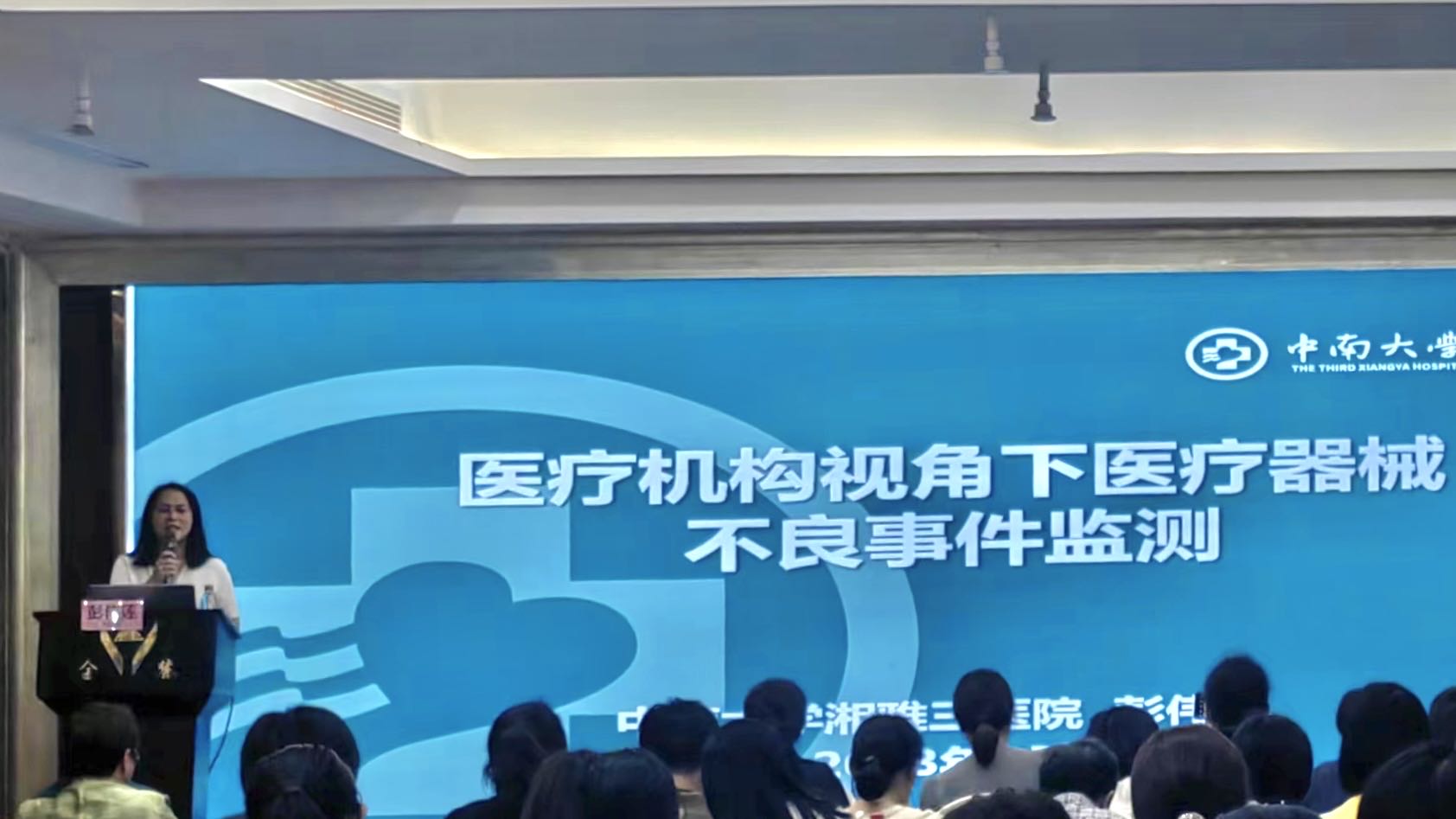 当天下午,还举办了药械化安全监管和不良反应监测培训,医院医学装备部主任彭伟莲受邀在会议上作“医疗机构视角下医疗器械不良事件检测”专题讲座。她围绕医疗器械不良事件政策背景,就国家卫生健康委员会、国家药品监督管理局、国家医疗保障局等有关部门重要文件精神进行了解读,并从国内外近5年不良事件报告情况、医院医疗器械不良事件相关工作开展情况及下一步工作计划等三个方面进行了专题分享。