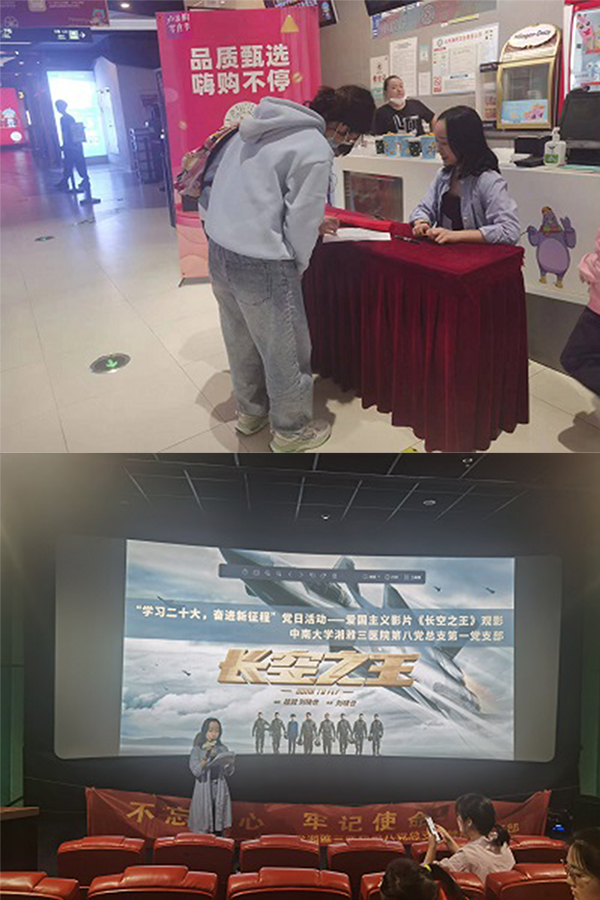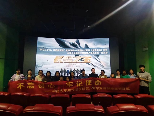 5月7日下午,为扎实推进学习贯彻习近平新时代中国特色社会主义思想主题教育,中南大学湘雅三医院第八党总支第一党支部(麻醉疼痛支部)在河西王府井卢米埃影城开展党日活动,此次活动主要内容是组织观看爱国主义教育电影《长空之王》。活动旨在进一步创新优化党组织生活方式,提高支部活动质量,增强党员队伍的凝聚力和战斗力。