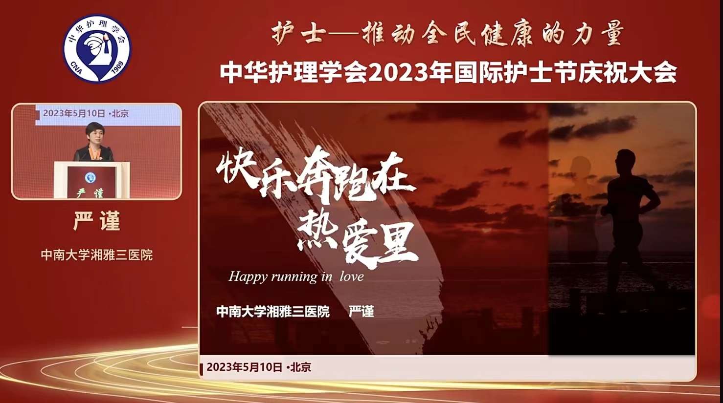 严谨作为杰出护理工作者代表进行发言,她分享了自己从“热爱”到“奔跑”到“快乐”的成长之路。她说道,“每一个选择不一定都是因为热爱,但每一个向上的灵魂都带着使命,应该努力在选择里寻找热爱,因为只有热爱,才会让奔跑充满力量,只有努力奔跑,才会收获快乐“。她衷心祝愿天下护理人能快乐奔跑在自己的热爱里。
