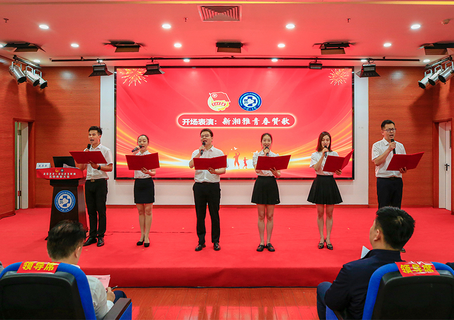 大会开始前,院团委带来了开场表演——原创诗歌朗诵《新湘雅青春赞歌》。节目展示和赞颂了医院医疗、教学、科研、管理各条战线的青年们在党的领导下,朝着医院高质量发展的目标奋力拼搏的良好精神风貌。