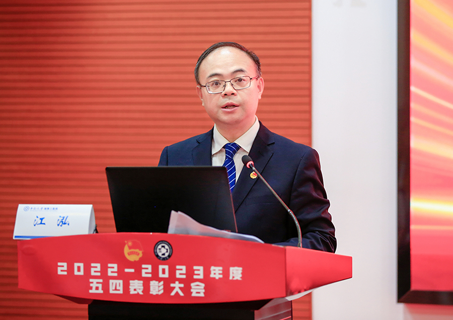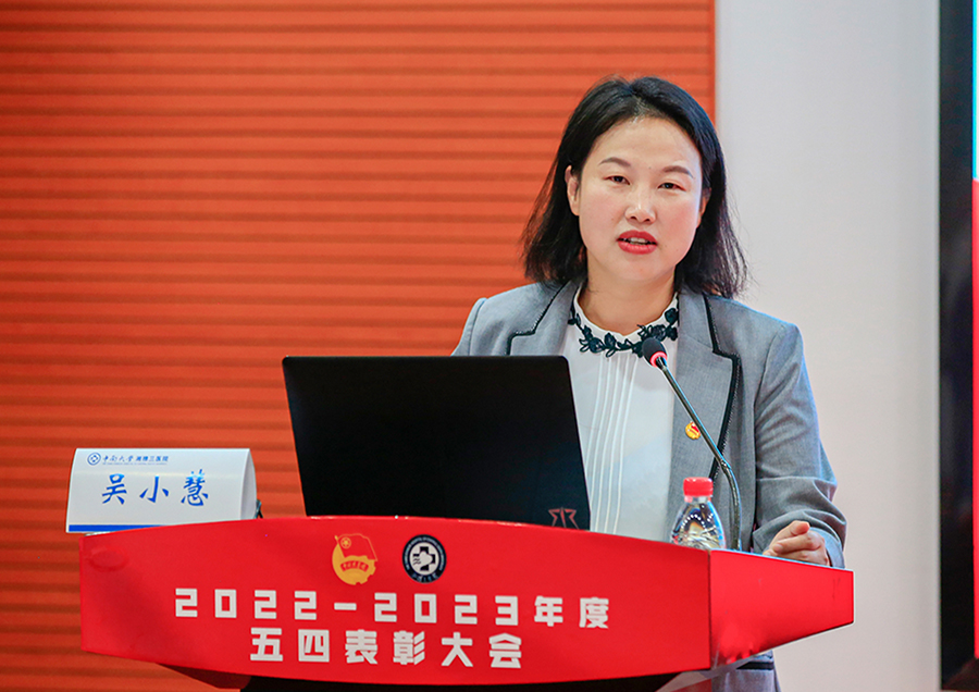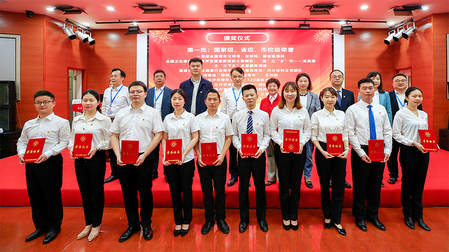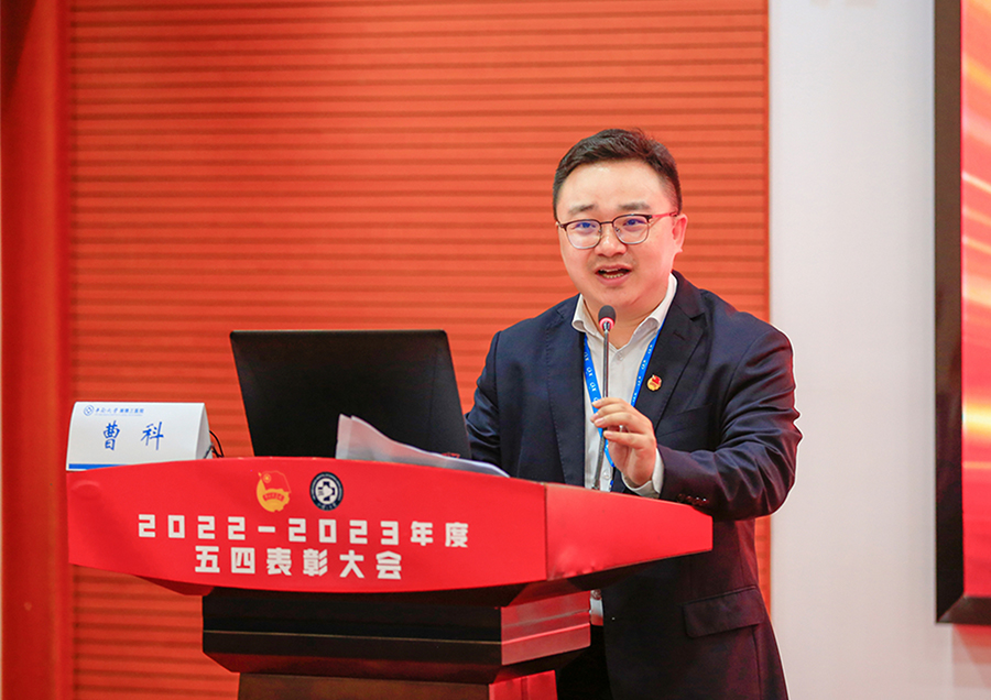 院党委委员、副院长曹科宣读《关于表彰2022-2023年度共青团工作先进集体、优秀个人的决定》。本年度,医院共青团工作荣获“一星级全国青年文明号”“全国卫生健康行业青年志愿服务项目大赛铜奖”“‘创青春’首届全国卫生健康行业青年创新大赛优秀奖”“全国‘这就是社工’短视频公益传播计划优秀奖”等国家级荣誉5项,首批“湖南省乡村振兴青年先锋集体”“湖湘最美丝路青年”“湖南省最美红十字志愿者”“湖南省优秀社会工作服务案例”“长沙市青年文明号”“长沙市青年岗位能手”“中南大学五四红旗团委标兵”等省级、市校级荣誉58项。同时医院评选出了一批院级先进集体和优秀个人。