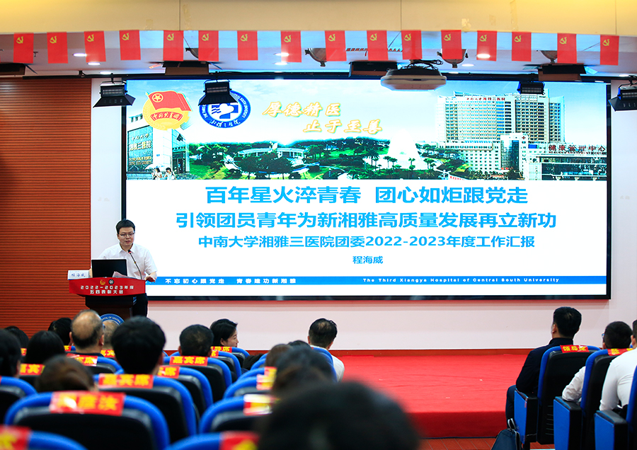 5月10日下午,中南大学湘雅三医院在外科楼二楼学术报告厅举行“学习二十大 永远跟党走 奋进新征程”纪念学雷锋活动60周年暨2022-2023年度五四总结表彰大会。团省委社会联络部部长吴小慧、湖南省卫健委直属机关团委书记杨彪,湘雅三医院领导何庆南、江泓、杨飞龙、费云、左笑丛、曹科,医院各党总支书记、关工委负责人、部分职能部门负责人、院团委委员、获奖人员代表、团干团员代表、青年医务工作者及学生代表共160余人参加会议。院团委委员、专职团干戴萍萍主持会议。
